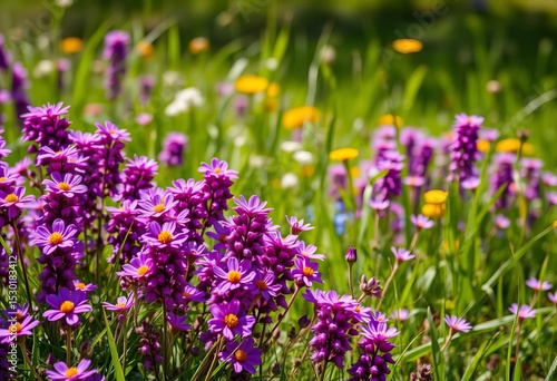Naklejka premium Vibrant purple wildflowers carpet a sun-drenched spring meadow, landscape photography, season