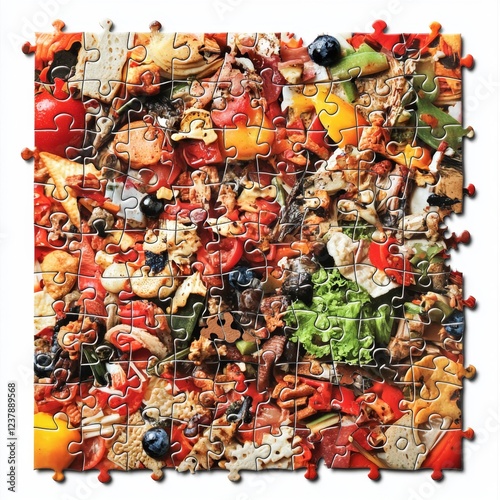 Naklejka premium Vibrant Puzzle Piece Arrangement Featuring Assorted Fresh Vegetables, Fruits,...