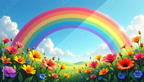 Fototapeta premium Vibrant rainbow arch over blooming wildflowers, sky, clouds, color