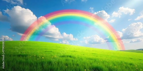 Naklejka premium Vibrant rainbow arch spanning a lush green field, bathed in sunlight Perfect for nature, fantasy, LGBTQ+, and vibrant imagery projects , whimsical, magical