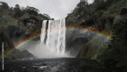 Fototapeta premium Vibrant rainbow arches over a powerful waterfall amidst lush green forest and...