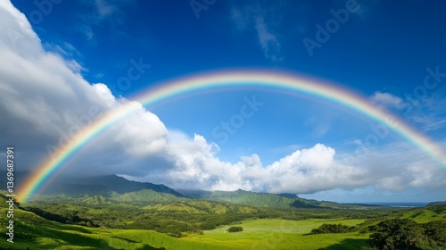 © Gro, Naklejka premium Vibrant Rainbow Arches Over Lush Green Valley, Colorful Nature Scene