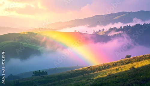 © gilz_r, Obraz premium Vibrant Rainbow Arches Over Misty Green Hills at Sunset.
