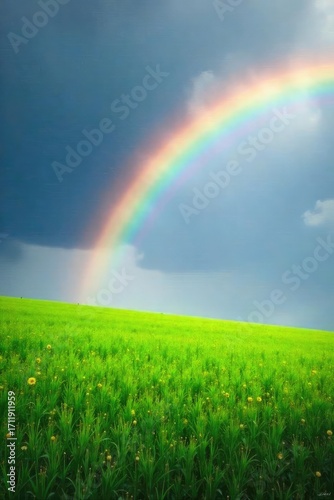 Naklejka premium Vibrant rainbow arching across a lush green field, sunlight illuminating its spectrum of colours Perfect for nature, fantasy, and whimsical themes , rainbow arch, hope