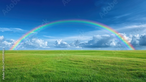 © Generative AI, Obraz premium Vibrant rainbow arching over lush green field under partly cloudy blue sky.