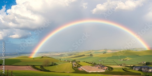 © Chom, Obraz premium Vibrant Rainbow Arcing Over Green Rolling Hills and Farmhouses Under Blue Sky with Cloudy Background