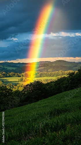 © ahmed, Obraz premium Vibrant Rainbow Arcing Over Lush Green Rolling Hills and Fields after a Summer Rainstorm A picturesque landscape photograph showcasing nature's beauty
