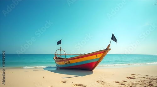 © TShirt Empire, Fototapeta premium Vibrant rainbow colored fishing boat with black flags on a pristine sandy tropical beach. Calm turquoise ocean and clear blue sky create a serene coastal paradise seascape.