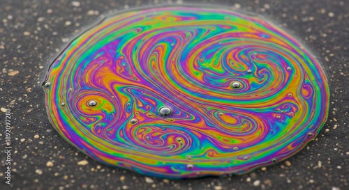 Fototapeta premium Vibrant rainbow colored oil slick on wet asphalt with swirling patterns and...