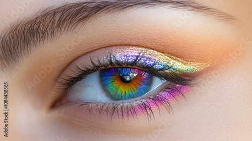 Obraz premium Vibrant Rainbow Eye Makeup with Colorful Glowing Contact Lens
