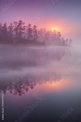 Fototapeta premium Vibrant rainbow fog drifts over still lake water Soothing colors reflect tranquility , landscape, serenity, vibrant hues