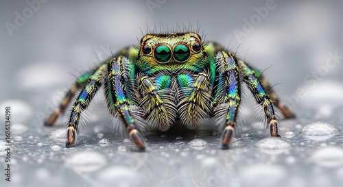 Fototapeta premium Vibrant Rainbow Jumping Spider on Dew-Covered Surface