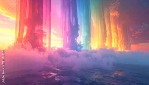 © gilz_r, Obraz premium Vibrant Rainbow Light Beams Illuminating Dreamy Cloudscape at Sunset.