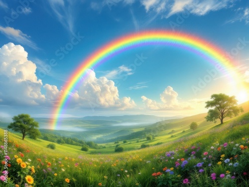 © Creative_trends_2025, Naklejka premium Vibrant Rainbow Over a Lush Green Meadow with Colorful Wildflowers