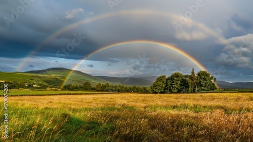 © Cao, Obraz premium Vibrant Rainbow Over Green Meadow: Colorful Nature Illustration with Sun, Clouds & Blue Sky