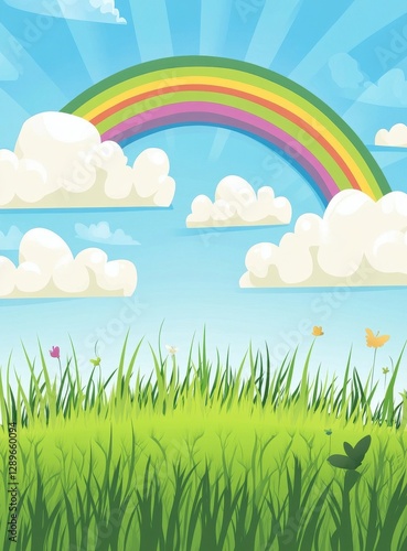 © Mind, Obraz premium Vibrant Rainbow over Lush Green Field and Blue Sky with Fluffy Clouds