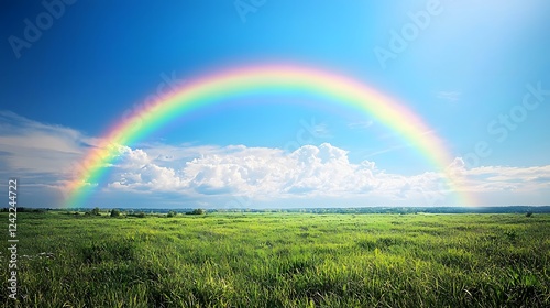 © Pitch Aya, Obraz premium Vibrant Rainbow Over Lush Green Field Nature Landscape Photography Bright Day View