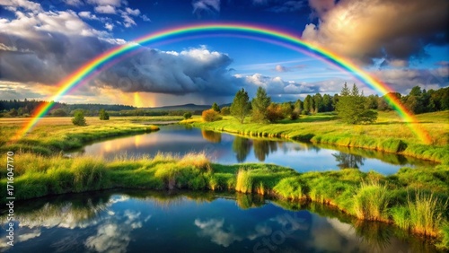 © Graphic Habib, Obraz premium Vibrant Rainbow Over Serene Waterscape Captures Nature's Splendor With Lush Greenery and Reflections Under a Dynamic Sky