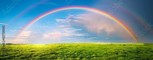 © Bussakon, Naklejka premium Vibrant Rainbow Over Verdant Field Symbolizing New Beginnings and Hope