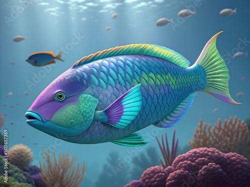 Naklejka premium Vibrant rainbow parrotfish swims gracefully through a sunlit coral reef