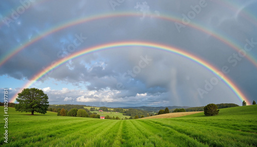 Naklejka premium Vibrant rainbow spanning lush green landscape after rain, natural beauty