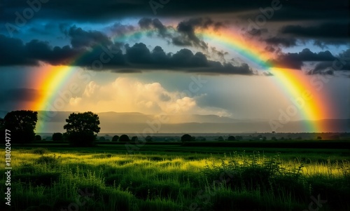 © YiuCheung, Obraz premium Vibrant rainbow spans a dramatic sky, contrasting dark storm clouds with bright sunlight, above a lush green field in a scenic natural landscape.