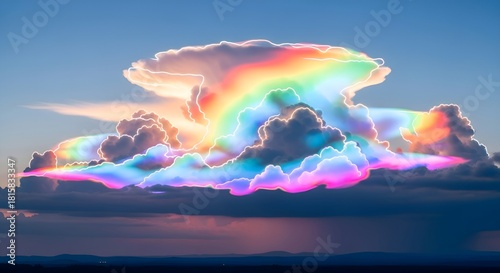 Fototapeta premium Vibrant Rainbow Spectacle Adorns a Majestic Cloud Formation at Sunset, Creating an Ethereal and Dreamlike Panorama of Natural Splendor and Atmospheric Beauty