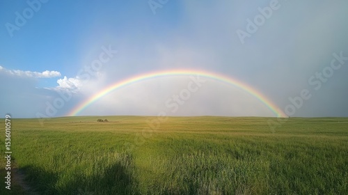 Fototapeta premium Vibrant rainbow stretches across a vast green field under a partly cloudy sky