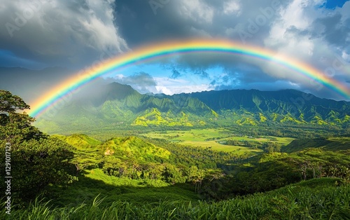 Naklejka premium Vibrant rainbow stretching across a lush green valley