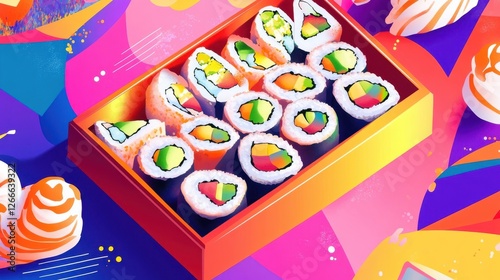 © Dragon, Fototapeta premium Vibrant Rainbow Sushi Rolls in Colorful Box