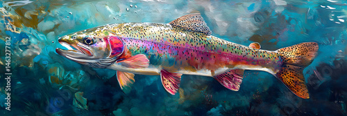 Fototapeta premium Vibrant Rainbow Trout Swimming in Pristine Waters with Iridescent Colors and...