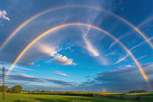 © Michael, Naklejka premium Vibrant Rainbow View Over Blue Sky and Green Pasture