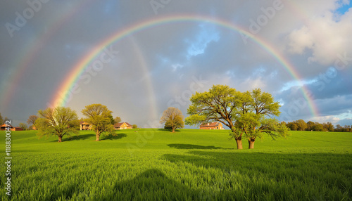 Fototapeta premium Vibrant rainbows arcing over lush countryside fields in spring, nature's beauty
