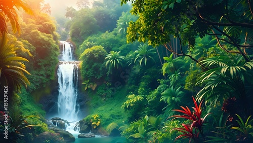 © Flop, Fototapeta premium Vibrant Rainforest Waterfall in Warm Colors