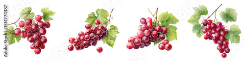 © T Studio, Obraz premium Vibrant, realistic red grapes with green leaves on branches, showcasing organic details in a botanical illustration style, perfect for decorative or culinary designs