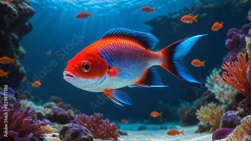 Fototapeta premium Vibrant Red and Blue Reef Fish Swimming Among Coral Underwater