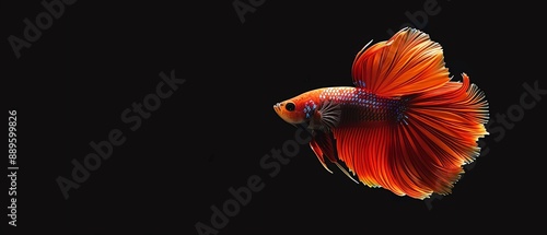 Obraz premium Vibrant red betta fish swims gracefully in dark water, showcasing its elegant...