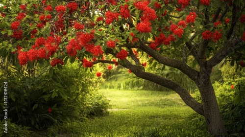 Naklejka premium Vibrant Red Blossom Tree in Lush Green Garden Lighting Up Pathway