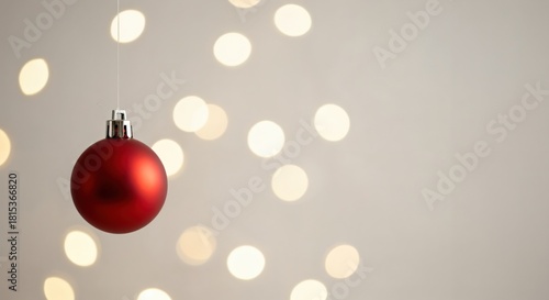 Fototapeta premium Vibrant red Christmas ornament hanging against a soft, warm bokeh background,...