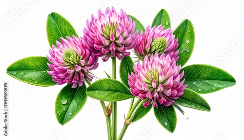 © Christhoper, Fototapeta premium Vibrant Red Clover Blossoms with Dew Drops on White Background.