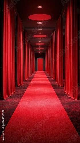 © Georg, Fototapeta premium Vibrant red corridor leads to an intriguing doorway in an artistic interior space at night