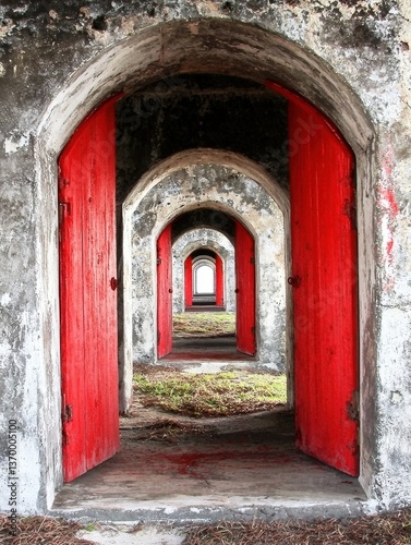 © warunthorn, Fototapeta premium Vibrant Red Doors Framed by Arched Stone Walls in Historical Building