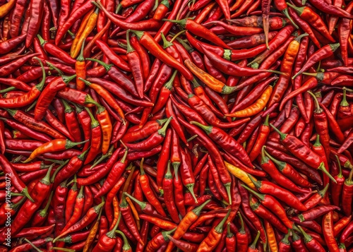 © Wanlop, Fototapeta premium Vibrant red dried whole chili peppers arranged in a repeating pattern create a spicy hot textured background or wallpaper design.