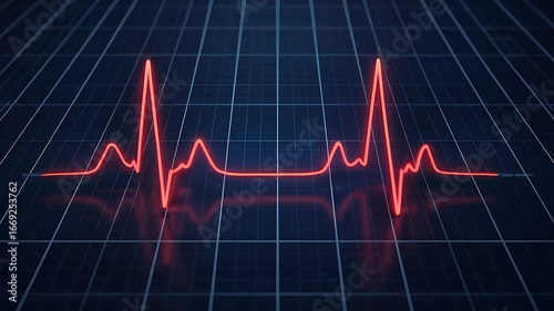 Naklejka premium Vibrant red electrocardiogram waveform pulsing across a dark blue grid...