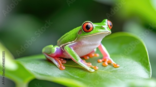 Naklejka premium Vibrant red-eyed tree frog on a lush green leaf