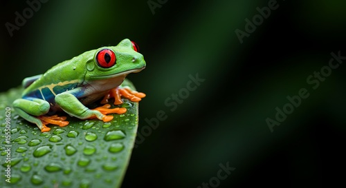 © LangkahKaki, Naklejka premium Vibrant Red-Eyed Tree Frog on Dew-Covered Leaf