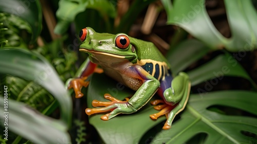 Fototapeta premium Vibrant red-eyed tree frog sitting on lush green leaves in a tropical...