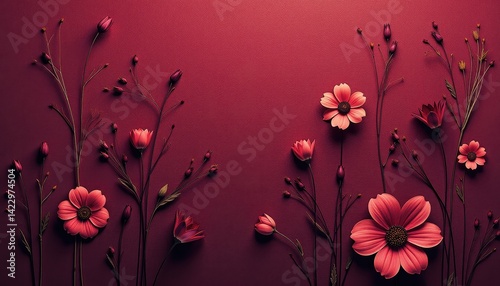 © Crazy Stock – Studio, Fototapeta premium Vibrant Red Flowers Against Deep Burgundy Background: Symmetrical Arrangement. A series of red flowers on a deep red background.