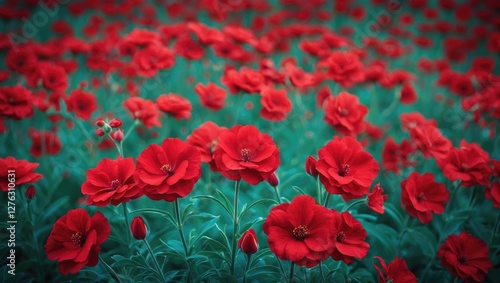 © The 2R Artificiality, Fototapeta premium Vibrant red flowers in a lush green field with soft focus background creating a vivid floral landscape