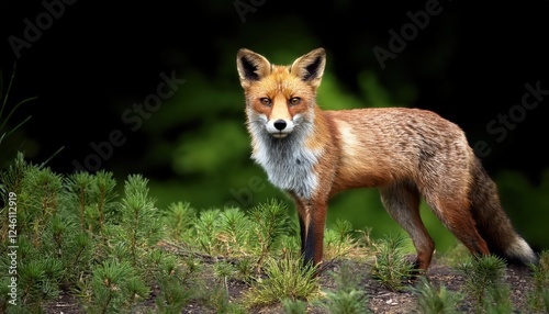 © netsay, Fototapeta premium Vibrant Red Fox Gazing Intently Amongst Summers Black, Brown, and Green Palette, Captured in a Moment of Wild Majesty